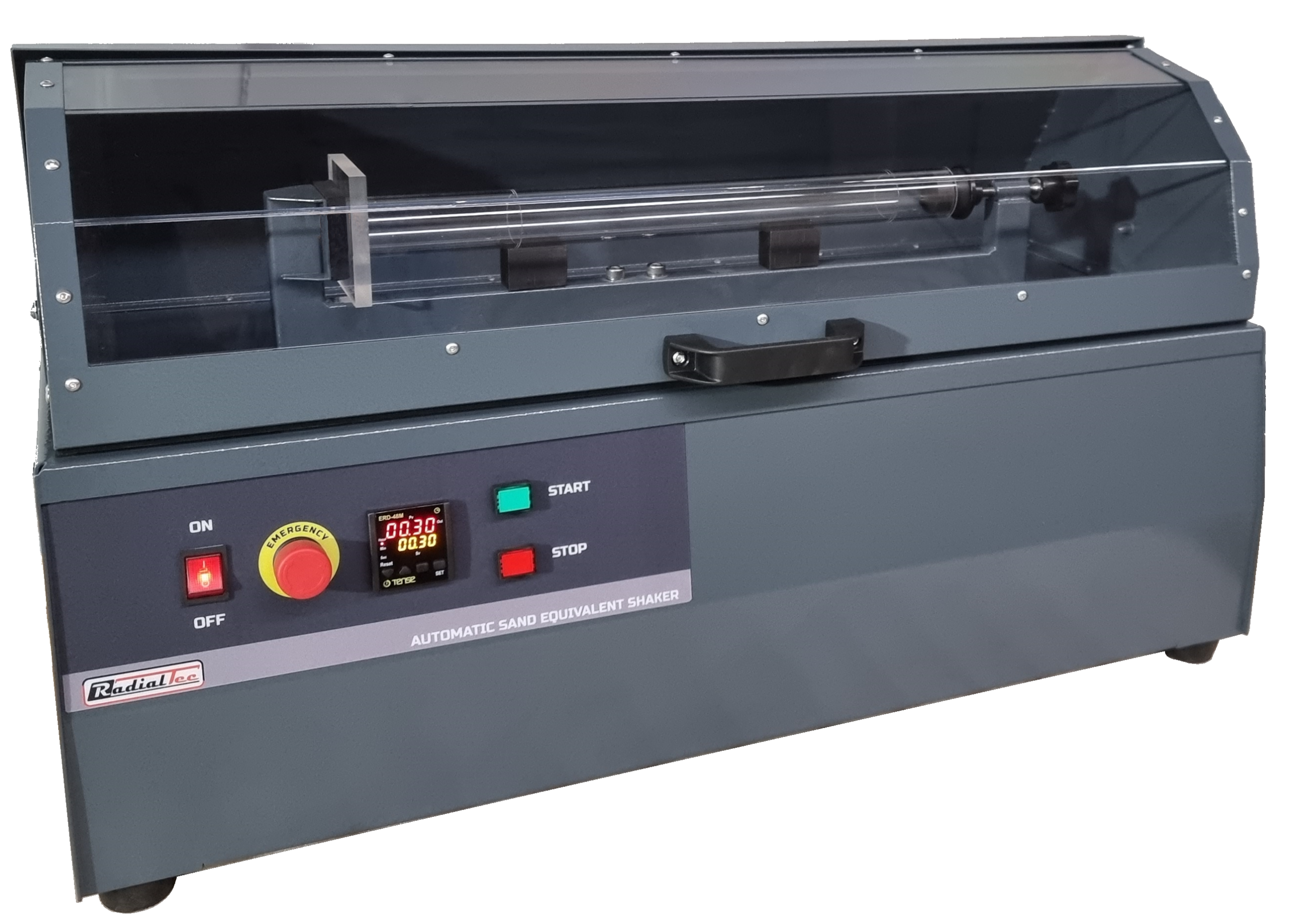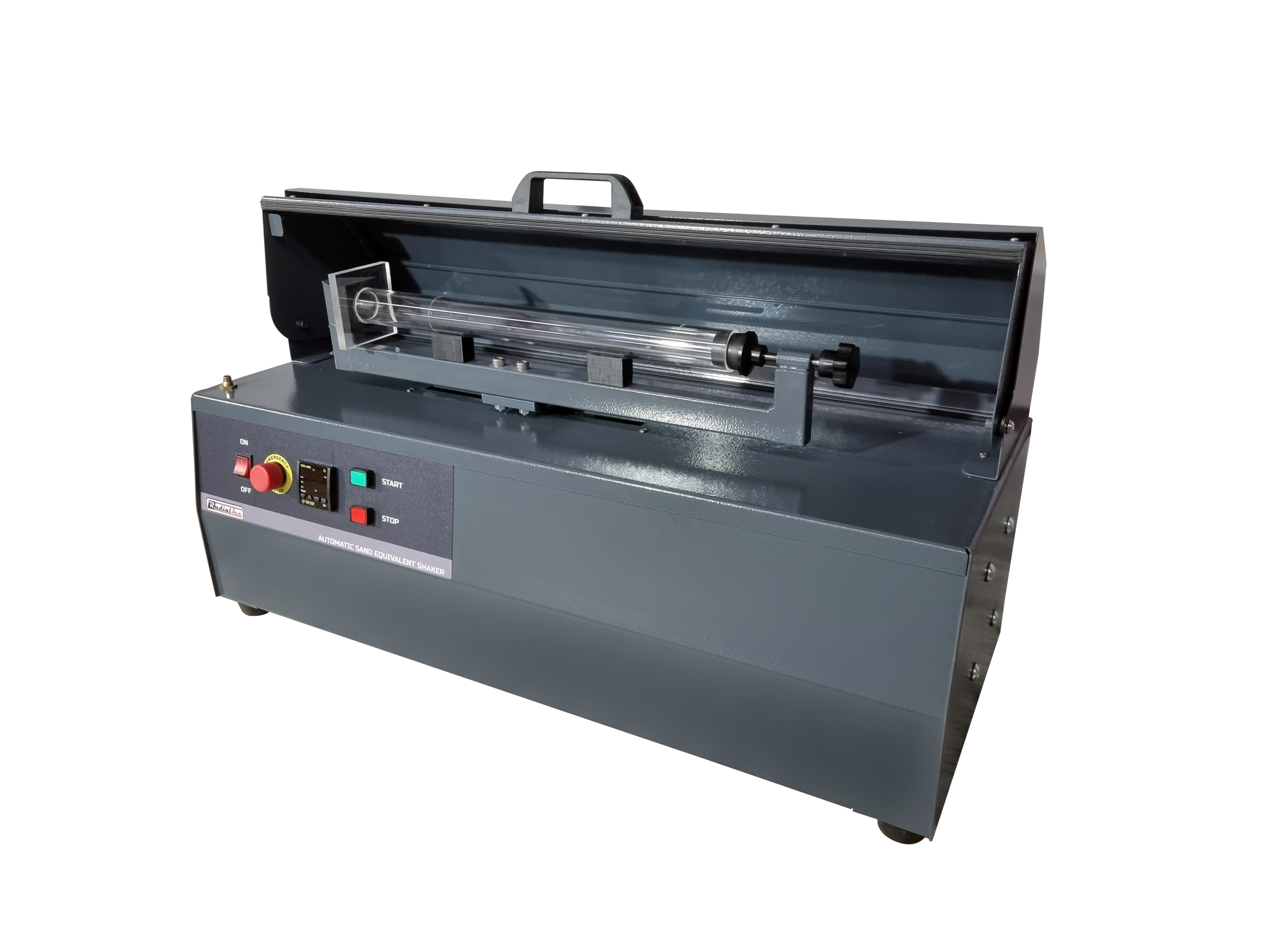 Шейкер для піщаного еквівалента використовується для забезпечення рівномірного струшування мірних циліндрів, при визначенні показника піщаного еквіваленту, із заданою швидкістю. Шейкер оснащений захисною кришкою і таймером. Відповідно до директиви CE прилад автоматично зупиняється, коли відкривається захисна кришка.
