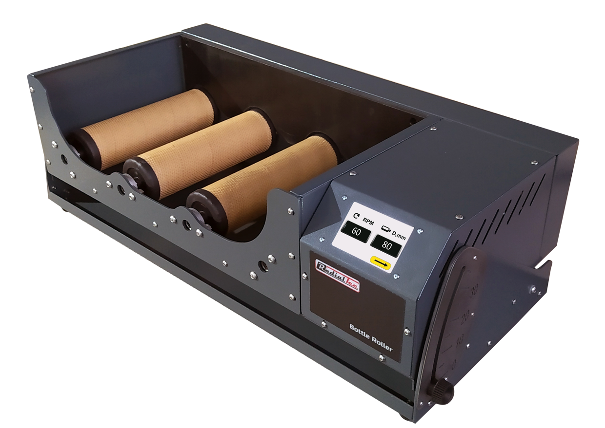 RT-MA-004 має можливість нахиляти ролики під необхідним кутом від 0° до 35°, а також має прогумовані пупирчаті ролики, які запобігають ковзанню бутлів під час випробування. Пікнометри та бутлі замовляються окремо.